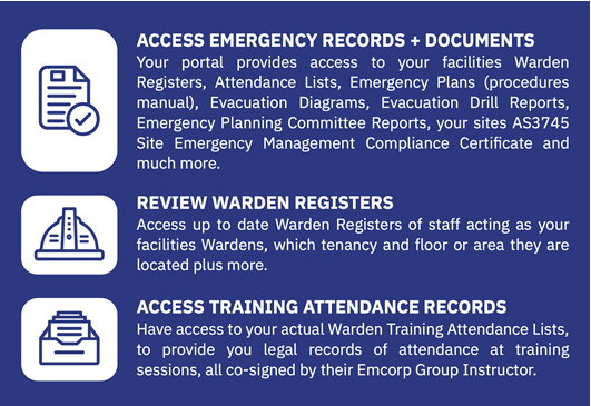 The RMI offers a comprehensive suite of tools designed to streamline your records compliance process, ensuring compliance, security and accessibility at every step. This includes (as applicable to your site) your Warden Registers, Training Attendance Lists, Emergency Plans, Evacuation Diagrams, Evacuation Drill Reports, Emergency Planning Committee Reports, Risk Assessments, Incident reports, your sites Emcorp Group supplied AS3745 or AS4083 Emergency Management Compliance Certificate and more.